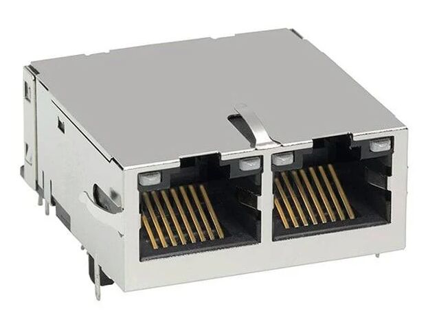 0826-1X2T-23-F Gigabit MagJack çift portlu RJ45 konektörü, entegre manyetikler, 12 çekirdek, EMI koruması, 1500Vrms izolasyon ve 10/100/1000Base-T Ethernet ağ ekipmanları için LED göstergeleri.